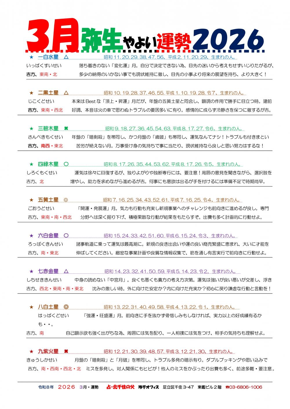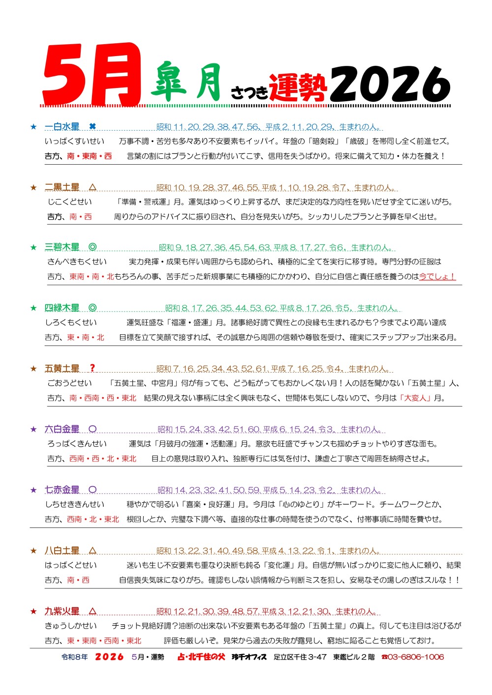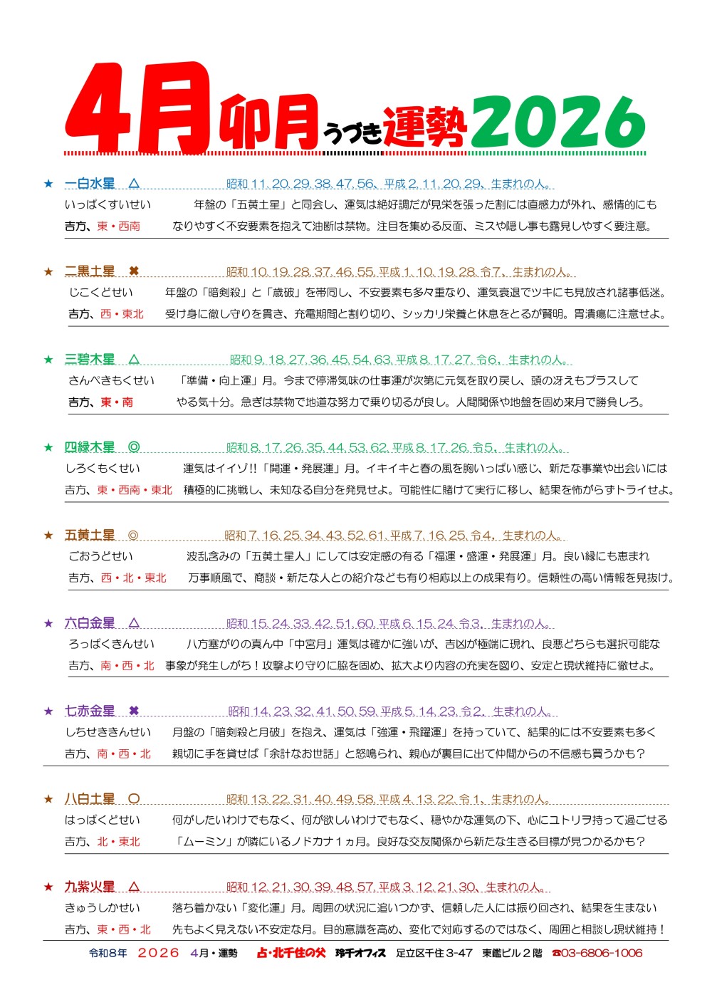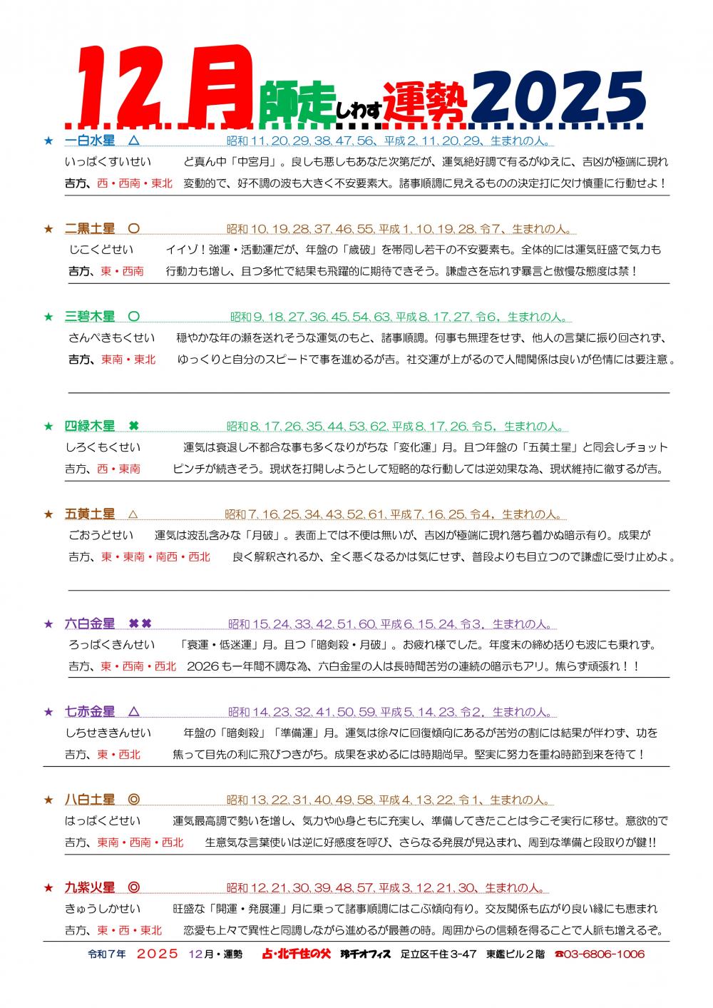 人は人生の中で幾度となく悩み、選択を繰り返します。 その悩みが大きければ大きい程、心身が疲れきってしまい正しい判断もできなくなってしまうかもしれません。 北千住の父 玲千オフィスでは、そんなあなたの悩みを少しでも軽く、楽になれるようお手伝いをさせていただきます。 さまざまな開運術とカウンセリングの技術を駆使し、一人ひとりじっくりお悩みをお聞きし、アドバイスさせていただきますので、不安なこと、お悩みがある方はぜひお問合せいただき、ご相談ください。 |